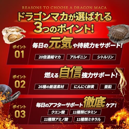 - 私は50代後半なのですが、若い頃のようなエネルギッシュな感じに戻れるのではないかと思って「ドラゴンマカ」を購入し、飲み始めました。結果として分かったことは 仕事、プライベートでも たいした変化はなく普段と変わらずですが、パートナーとの時間には想像以上にたくましくなって持続すること、なにより連射が可能になりました。こんなことならもっと早く試すべきでした。今では「ドラゴンマカ」は手放せないサプリメントとなりました。提供しているメーカーには感謝しています。
