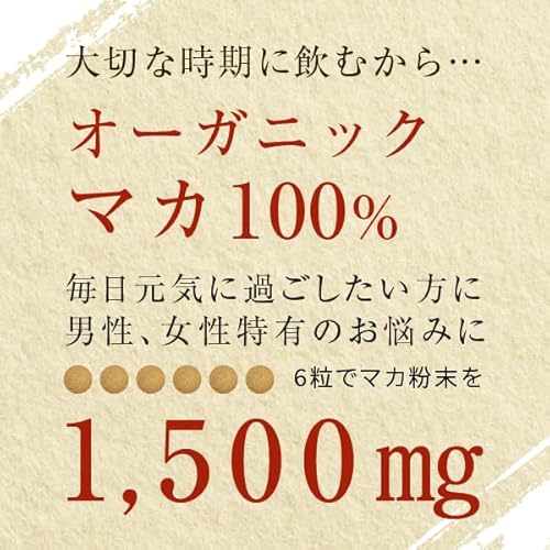 - 数年前に「オーガニック マカ ニチエー」を服用し、疲れを感じにくいことを実感していましたが、そのうちに「体調の変化は気のせいかなも?」と思うようになり、一時利用を中断していました。すると疲れが抜けないような違和感など体調が優れないような感覚があったので、再度 ニチエーの「オーガニック マカ」を購入して飲み始めました。しばらくすると、女性特有の周期も整ってきていることなど体調が安定してきていることを感じました。私の体質はこのサプリに合っていることが分かり、すっと1日3〜4錠を服用しています。香ばしいテイストで飲みやすいです。