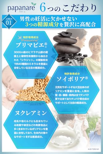 パパになる準備を始めよう。男性向けオールインワン妊活サプリ、3種の清源成分:40種類のミネラルを豊富に含む特許取得成分プリマビエ、大豆由来のポリアミンを豊富に含有する特許取得成分のソイポリア、生体内の様々なサポートをするヌクレアミンを配合。