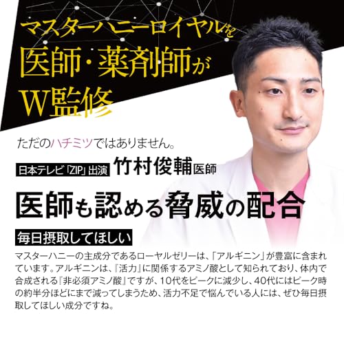 ロイヤルハニーと飲み比べたい製品 1つ目「Master Honey ROYAL」は、良質な成分の配合バランスと日本テレビ「ZIP」出演歴のある竹村医師、書籍も出している薬剤師:宮本先生の監修のもとで開発。
