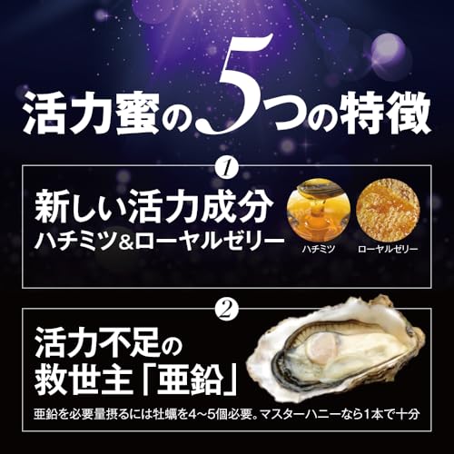 ハイブリッドクラチャイダム、天然タウリン、高麗人参、Lアルギニン、Lシトルリンの豊富な成分。「Master Honey ROYAL」1つ:1日分で、牡蠣4~5個分の亜鉛、150種類以上の栄養成分:ハチミツ+ローヤルゼリーを摂取できます。